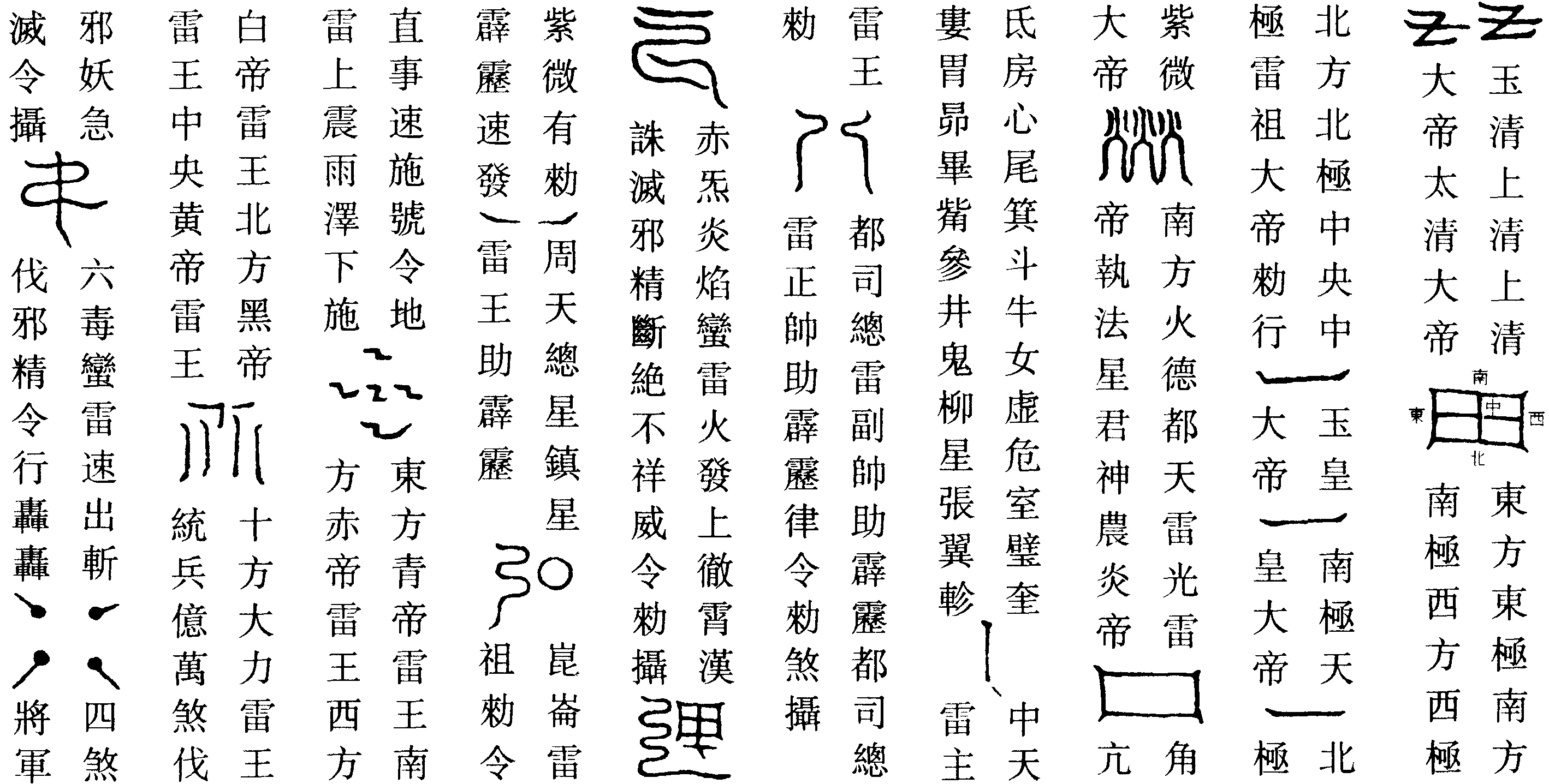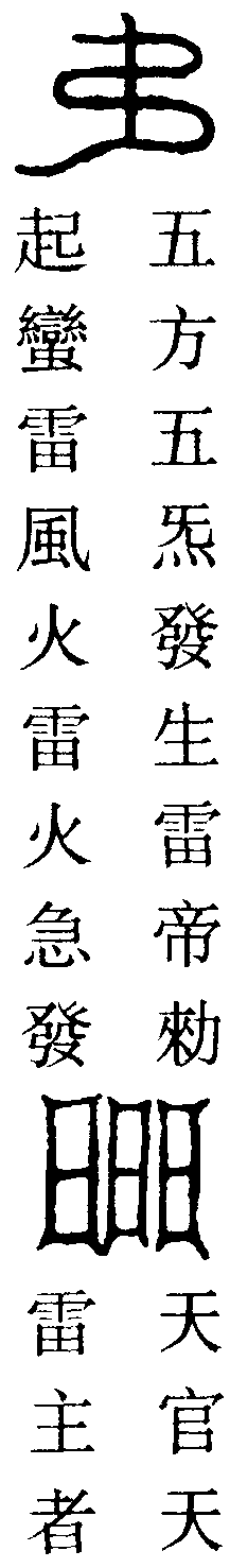 南熒朗耀,冰鳩羅真。真精陽神,暖炎寮靈。五方霹靂,石阿雄聲。電光變化,九州社令。聖光威猛,大布火輪。火雲萬丈,八車八輪。霹靂前奔,昊天敕行。都天震雷,玉晨洞靈。水部束首,火怪滅形。淳丘真君,紫虛通神。伐惡大將,急急施行。急急如道祖鳴雷大帝律令。