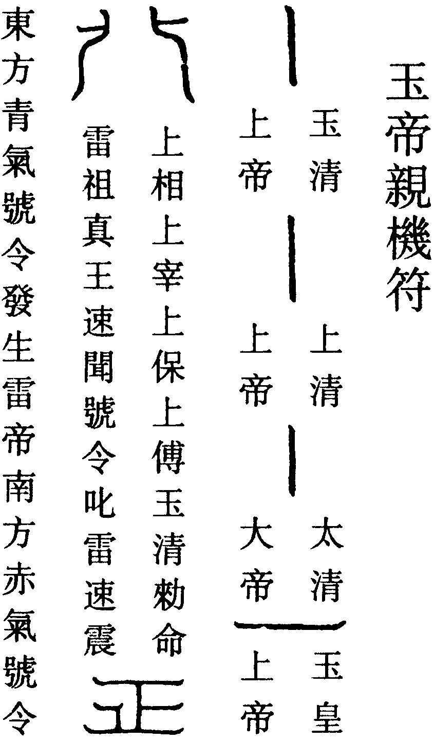 玉帝有敕,威震龍庭。五雷召雲,驅役六丁。風伯混混,雷電奔星。天雨下降,霶沱如傾。急急如高上神霄玉清真王律令敕。