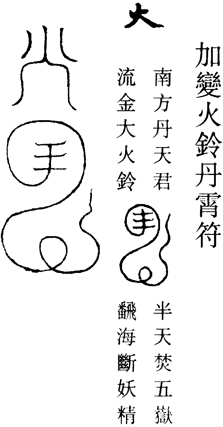 赤帝火王,圍中明煌。刀劍如雨,斬鬼火王。符召立至,急攝無疆。謹請南方火德熒惑星君,火鈴將軍,火鈴神將,火鈴童子,火鈴吏兵,火輪火車將軍,驅雷光,撼火鈴。攝丙丁,駕火雲。上下八方都罩定,邪鬼出者化為塵。急急如南極火鈴帝君律令敕煞攝。