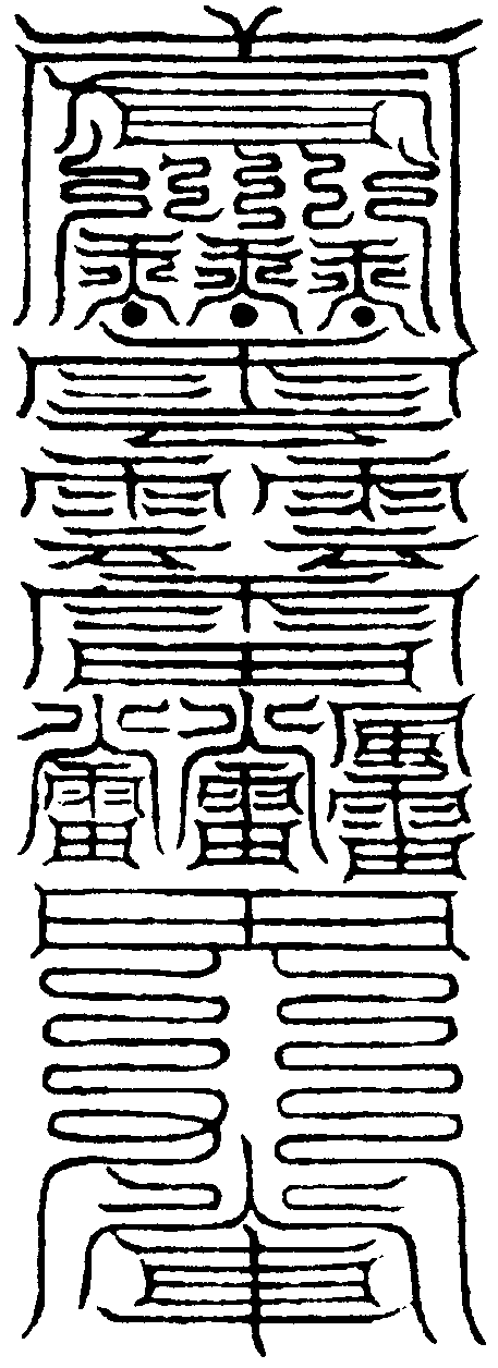 右符用鐵銅鑄模刻之,酒調朱砂印之。乃能興雷致雨,起雲發電,斬兇破邪,却蠱驅瘟,封山破洞。