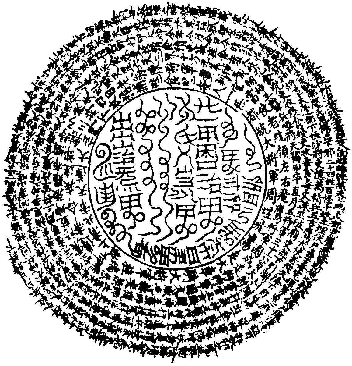 右符檄如前,內圈五寸徑。起艮順寫至艮止。周圍七行,黃紙朱書。