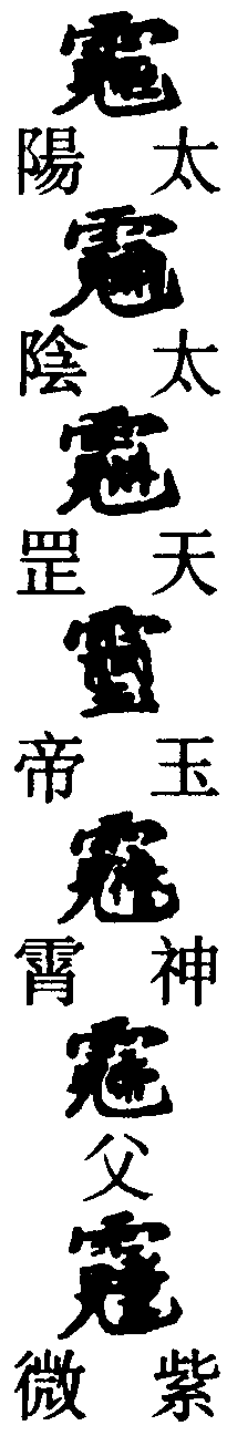 微妙真空,神霄趙公,驅雷掣,走火行風,何神不伏,何鬼敢衝,神虎一噉,萬鬼滅蹤,吾今敕召,速出絳宮,急急如老祖天師六合無窮高明大帝律令攝