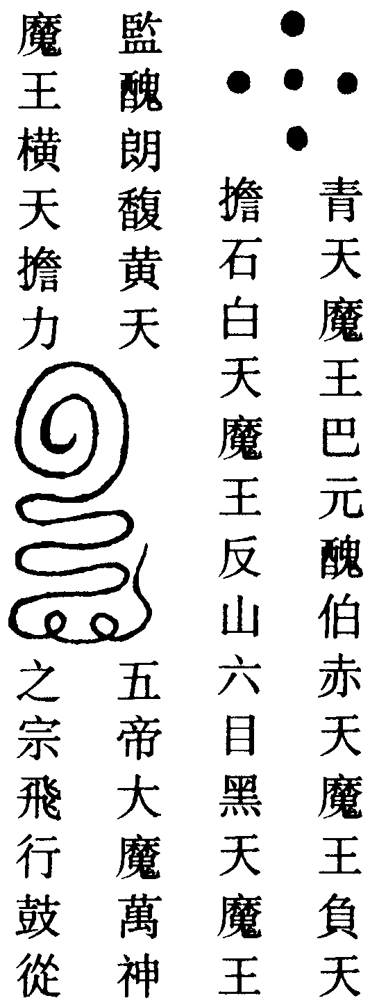 謹請上帝朝皇君,飛龍天罡河魁神。急降追魂速縛,速捉九醜大聖赤髮魔王韓儀攝。