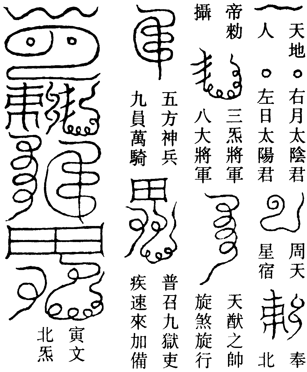 黑帝靈靈,六洞真靈。焦曾上令,斬滅邪精。罪屬酆都,一一錄名。敢有不順,風火滅形。奉北帝敕焦曾二大將,賜吾大威力。不論遠近,悉皆捉攝。大小高下,或鬼或神,或邪或精,急捉附上,不得有違。急急如律令。