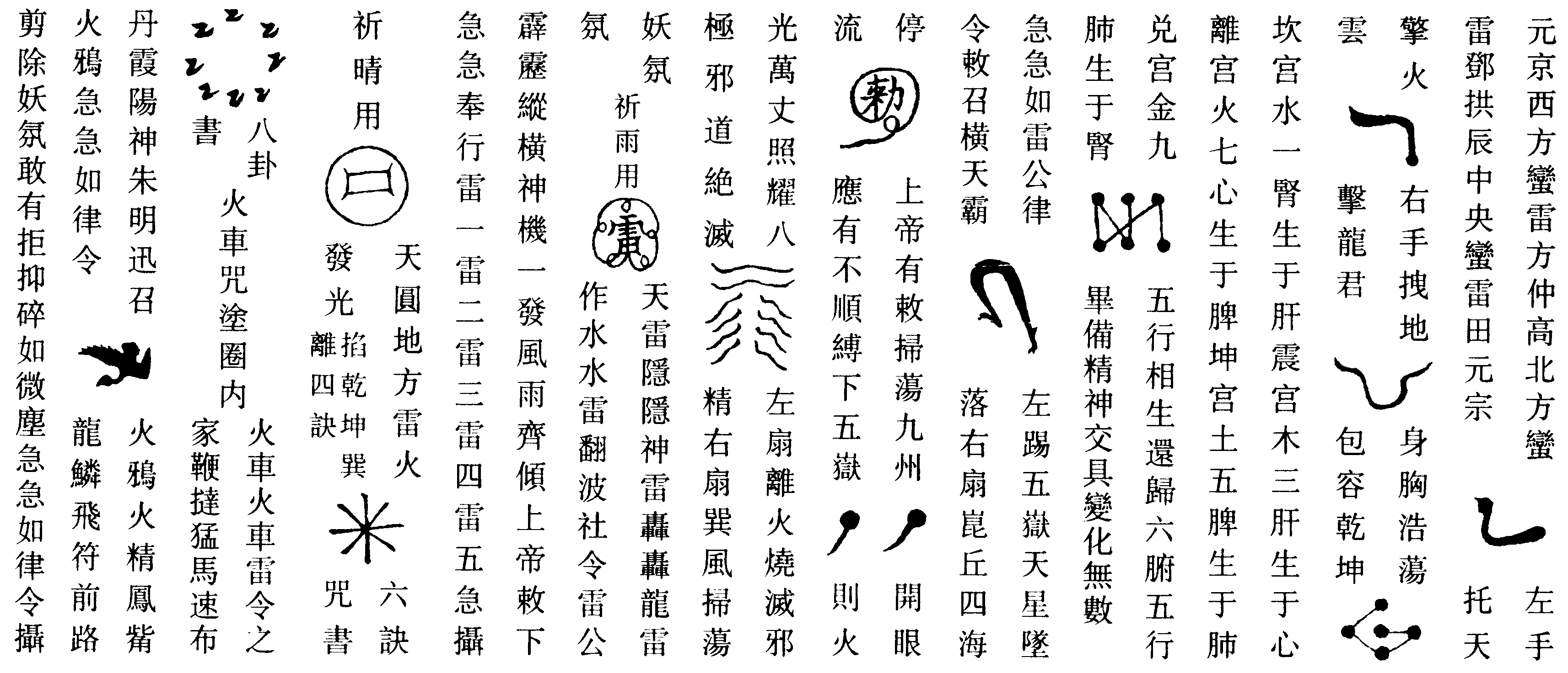都天雷公,飛雲震風,青雷赤氣,上游上穹,赤雷黃氣,運雷歸中,黃雷白氣,洞按九宮,白雷黑氣,下遊元酆,黑雷青氣,運雷歸東。