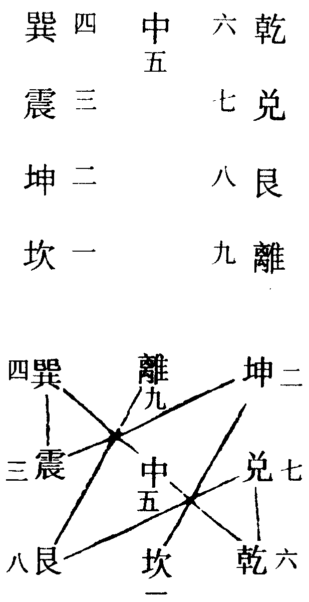艮。一。兌。二。坎。三。離。四。震。五。巽。六七。坤。八。乾。九。